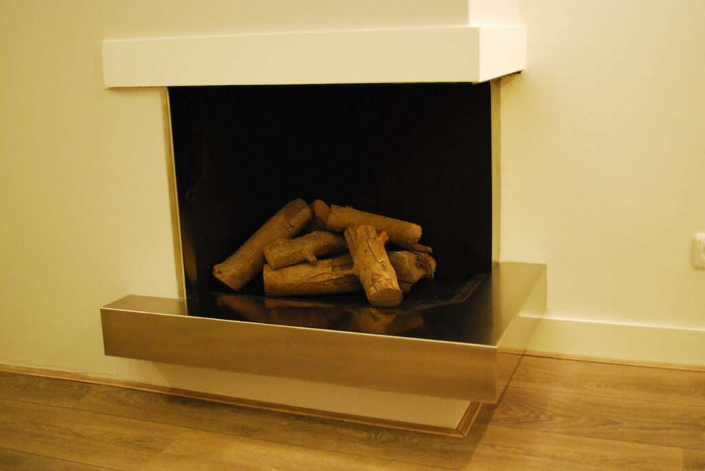 De oplossing was een RVS haardombouw op maat. Geborsteld RVS aan de zijkanten van de haardopening en een brede, strakke sokkelplaat die als hearth fungeert en licht uitsteekt over de vloer. Eenvoudig in uitvoering, groot in effect.